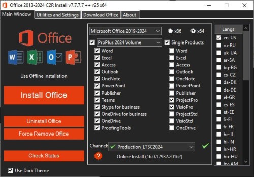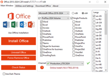Dieses Programm wurde für die Online-Installation und Aktivierung Microsoft Office 2013/2016/2019/2021/2024 C2R entwickelt. Sie können auch eine benutzerdefinierte Installation von Office Offline für die spätere Verwendung erstellen.